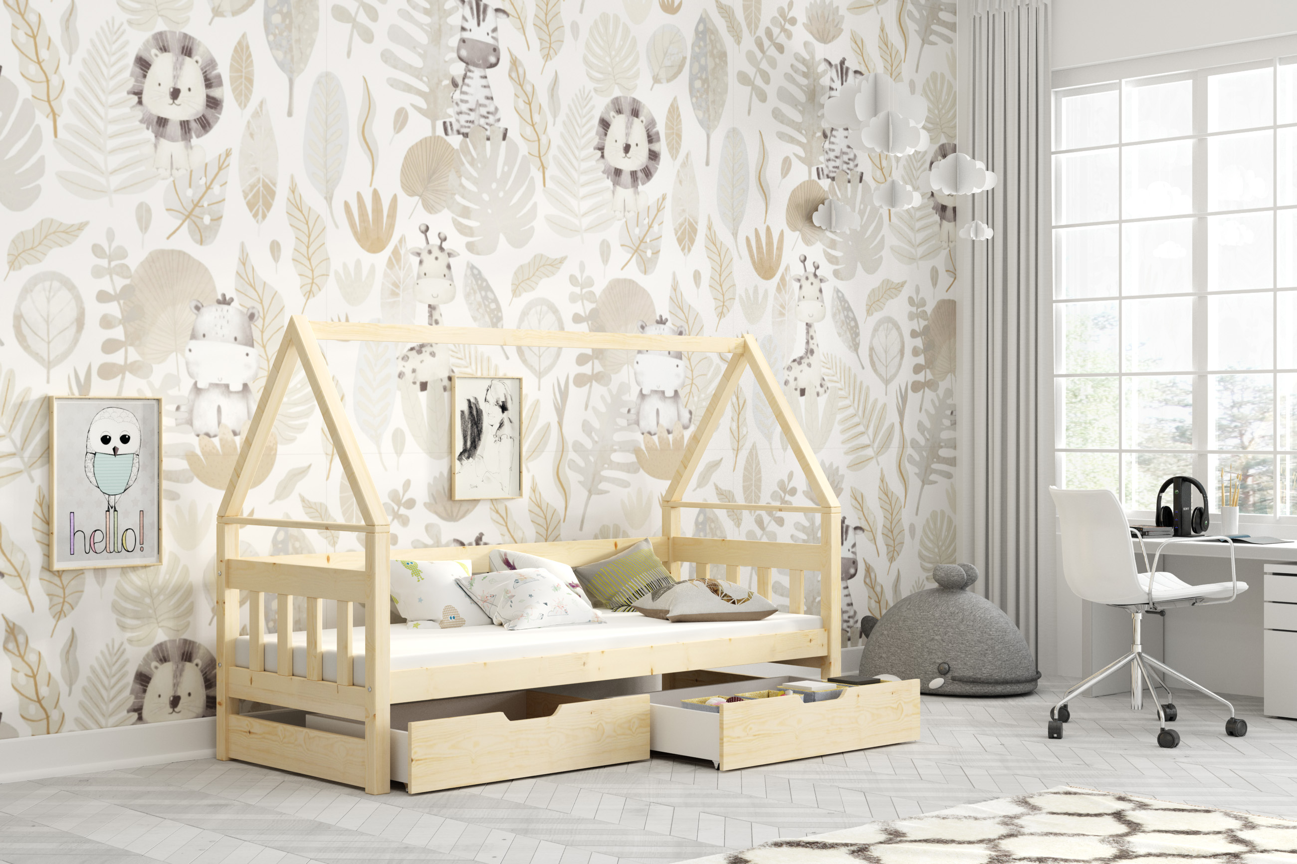 - Dřevěná postel DOMEK 75x180 cm bez zábrany borovice masiv s úložným prostorem a s matrací