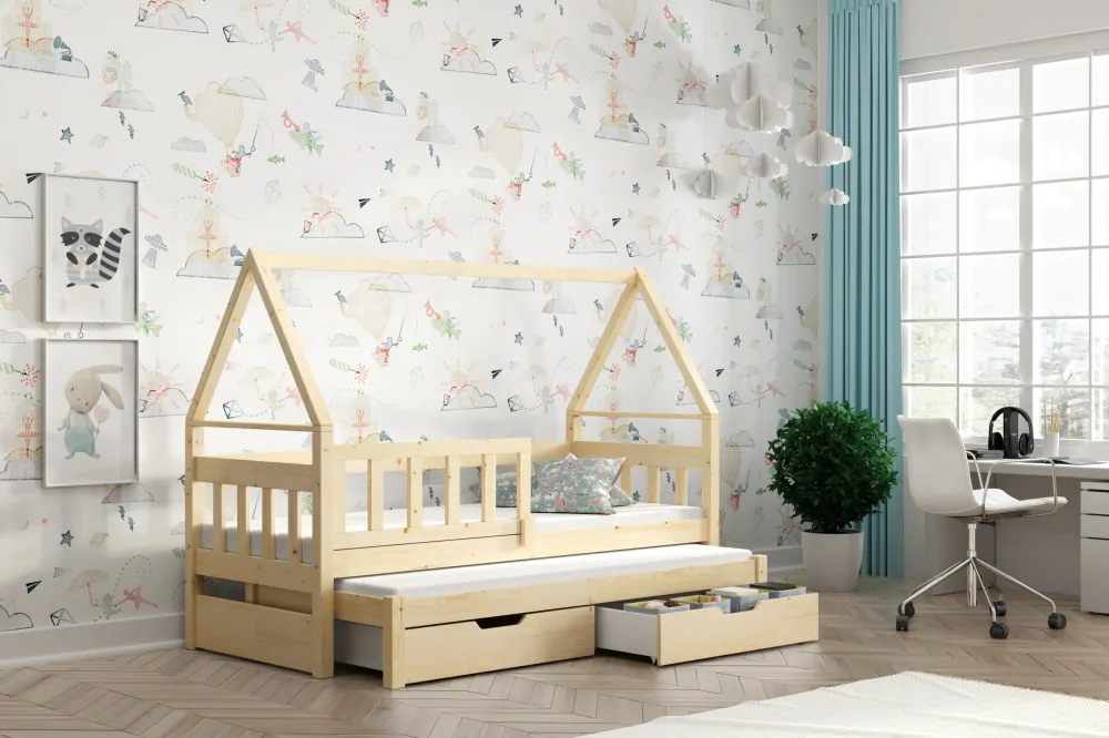 Dřevěná postel DOMEK s výsuvnou přistýlkou a nasazovací zábranou je vyrobena z borovicového dřeva, natřena ekologickými barvami na vodní bázi (certifikovaná bezpečnost).