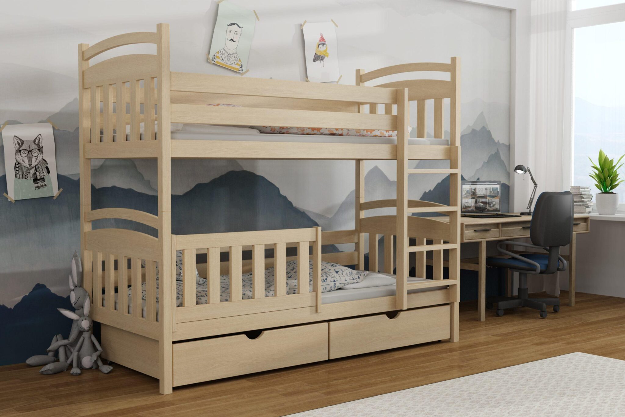 Praktickou součástí patrové postele jsou úložné prostory na kolečkách.