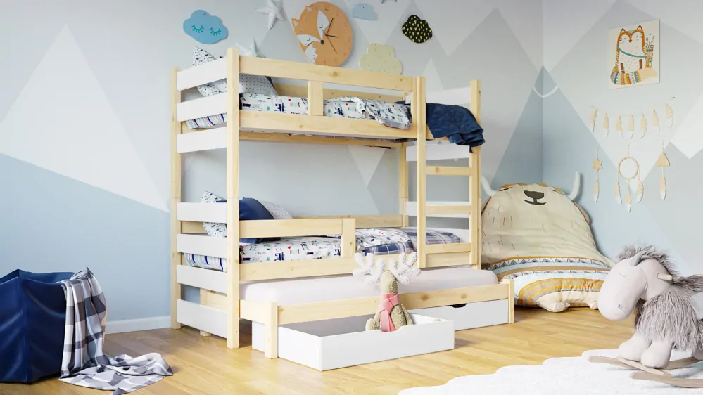 Patrová postel KAROL s výsuvnou přistýlkou je vyrobena z borovicového dřeva /barevné díly jsou z MDF desky.