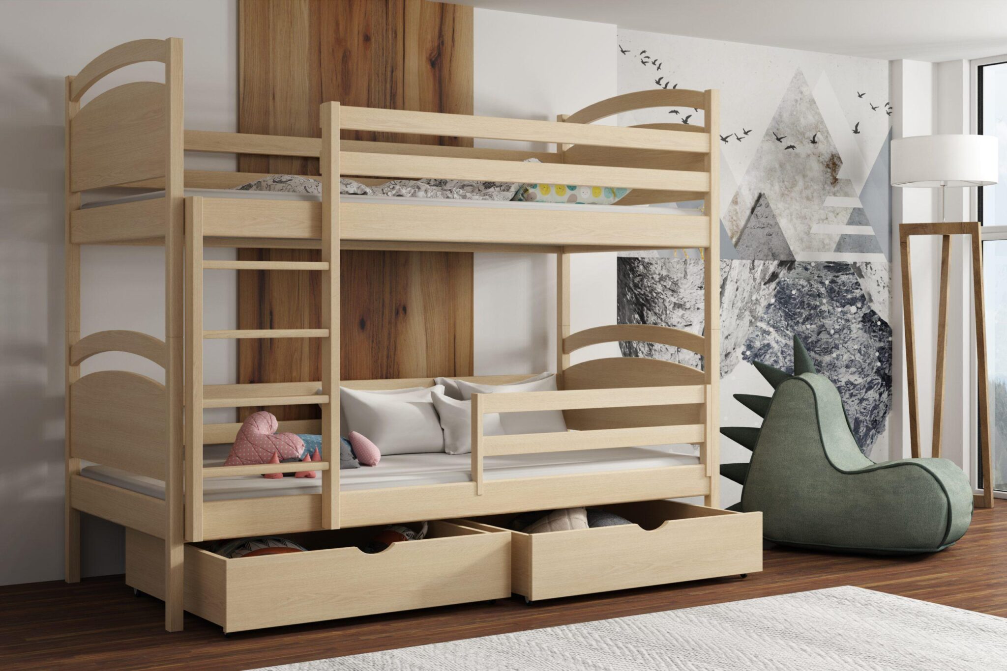 Praktickou součástí patrové postele jsou úložné prostory na kolečkách.