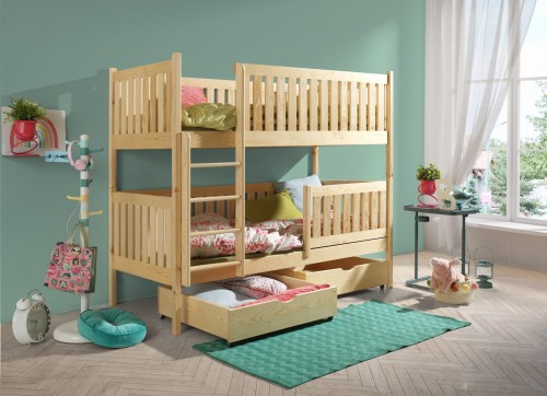 Dvoupatrová postel Gabi je celá vyrobena z masivního borovicového dřeva, třikrát lakovaná ekologickými barvami.