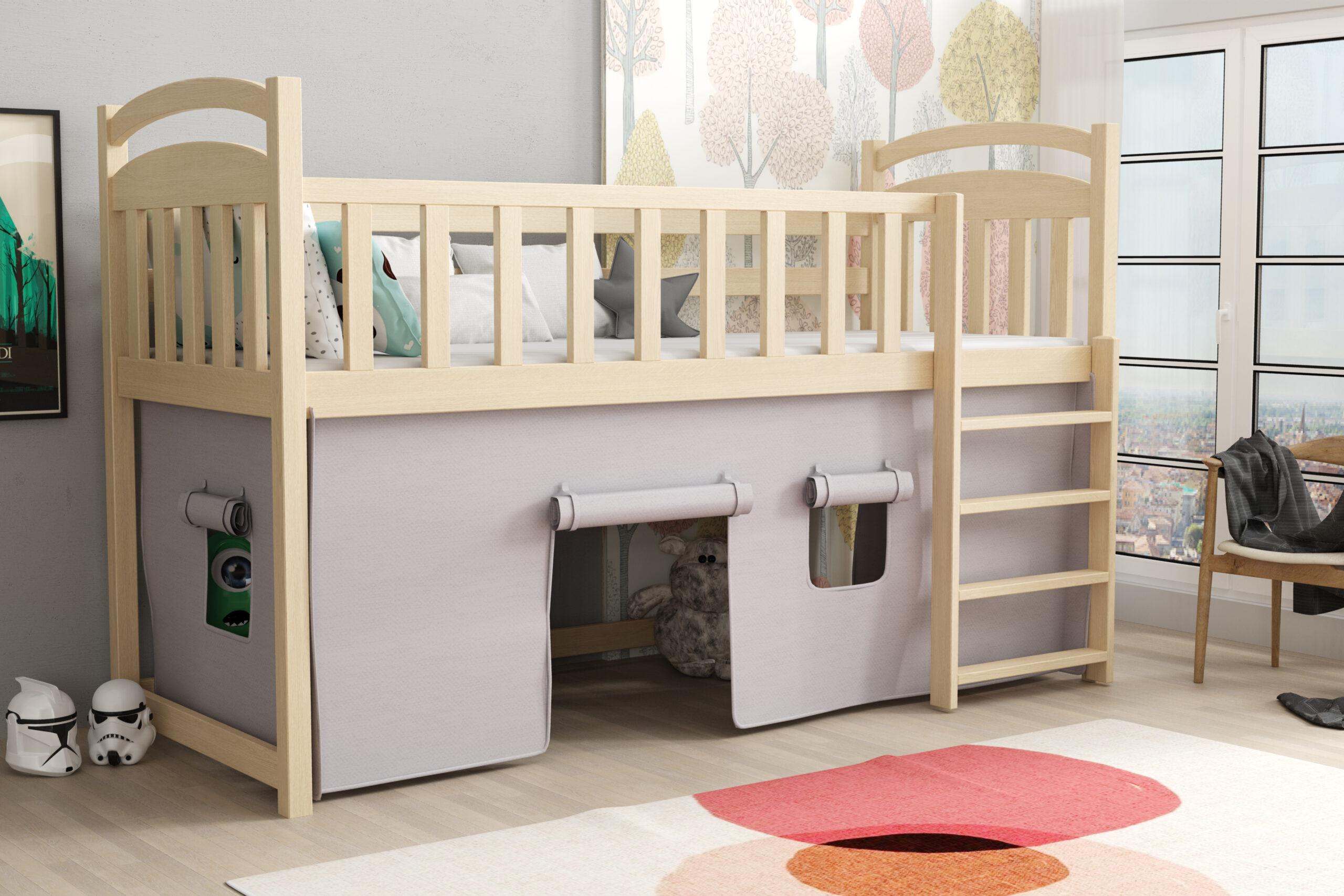 Vyvýšená patrová postel 03 80x190 cm se závěsem borovice masiv - více odstínů